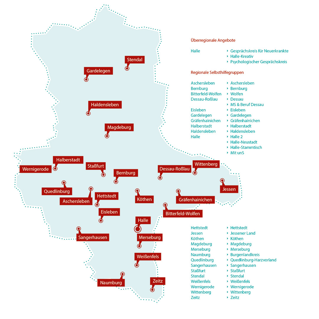 In Sachsen-Anhalt existiert ein flächendeckendes Netz von Kontaktgruppen unter dem Dach der DMSG. In den Kontakt - und Selbsthilfegruppen haben sich Personen freiwillig zusammengeschlossen, die vor ähnlichen Lebenssituationen stehen und von vergleichbaren Problemen betroffen sind.